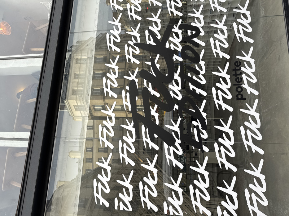 The image displays a clear glass storefront window in Paris, France, exhibiting both applied decals and reflections of the exterior environment. Dominating the window are numerous instances of the word "Fuck" in a handwritten script font. Most instances are white, arranged in horizontal rows across the lower two-thirds of the window. Centrally, a larger "Fuck" appears in black, overlapping some white text and partially obscuring the word "EDITION" in a similar black script. Near the bottom center, the word "polette" is visible in grey, sans-serif text. Reflected in the window are classic Parisian Haussmannian buildings with light-colored facades, multiple windows, and balconies, indicative of a typical urban street in the city. The sky above these buildings appears overcast. Through the upper part of the window, the interior of the establishment is visible, featuring two light-colored wooden stools positioned near another window or partition. A vague silhouette of a person is discernible behind one of the stools. A cylindrical, orange-tinted light fixture hangs from the ceiling. Through the lower part of the window, beneath the main textual decals, the shop's interior displays rows of eyewear on shelves, extending into the background. The floor inside is a uniform light grey. No explicit actions or interactions between people are depicted.