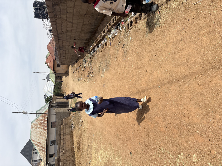 The image displays a sunlit, unpaved reddish-brown dirt road within a residential area of Jos, Nigeria. Several children are present. In the foreground, a young girl wearing a navy blue school uniform dress with a light blue collar and white sneakers walks towards the viewer, holding a clear plastic water bottle in her right hand. Her shadow is cast behind her to her left. To the left, a series of low, unfinished concrete block walls delineate property lines, behind which are single-story residential buildings with corrugated metal roofs, some rusty, and a dark, pyramidal-roofed structure further back. Utility poles with overhead wires line this side of the road. To the right, a tall concrete block wall topped with strands of barbed wire extends into the background. Along the base of this wall, a concrete drainage channel is visible, partially filled with refuse including plastic bottles and debris. A child in a red and white patterned dress is seen balancing on the edge of this drainage channel, facing right, with arms outstretched. In the far foreground on the right, the lower body of another child is partially visible, wearing a light-colored t-shirt with a dark design, dark trousers, and dark footwear, holding a plastic bottle with a red cap. Further down the dirt road, towards the mid-ground, other children are observed. One child, wearing a dark uniform and a backpack, walks away from the viewer. The background features additional low-rise buildings with various roof types, including reddish-brown tiles and more corrugated metal, under a bright, partly cloudy sky. Sparse, dry vegetation grows along the edges of the road and near the structures.