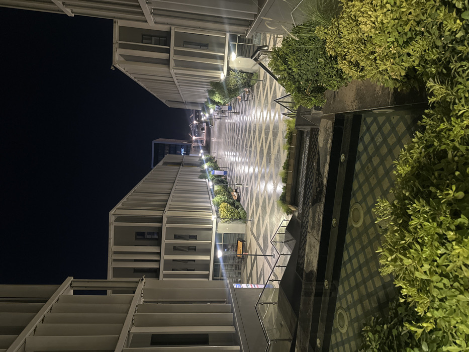 The image captures a modern, illuminated pedestrian plaza at night in Fez, Morocco. The scene is viewed from an elevated position looking down a wide, central walkway. In the foreground, a dark-colored staircase with metal handrails descends into the frame, partially obscured by lush green foliage. Below the stairs, a patterned tiled area displays what appears to be a shallow, reflective water feature with embedded circular lights. The main subject is a long pedestrian thoroughfare, paved with a distinctive geometric pattern of light and dark tiles, appearing wet and highly reflective from the artificial illumination. The walkway is flanked on both sides by contemporary multi-story buildings featuring prominent vertical slatted facades and numerous windows. Between the buildings and the walkway, landscaped strips contain green bushes and small trees. Numerous modern streetlights with glowing globes illuminate the path, casting strong reflections on the wet surface. Several light-colored wooden benches are positioned along the sides of the walkway. The pathway extends into the background, where more distant lighting is visible, leading to a larger, modern building with a dark, reflective facade. The sky above is uniformly dark. No individuals are present, and no discernible actions or interactions are occurring. The environment is well-maintained and devoid of debris.