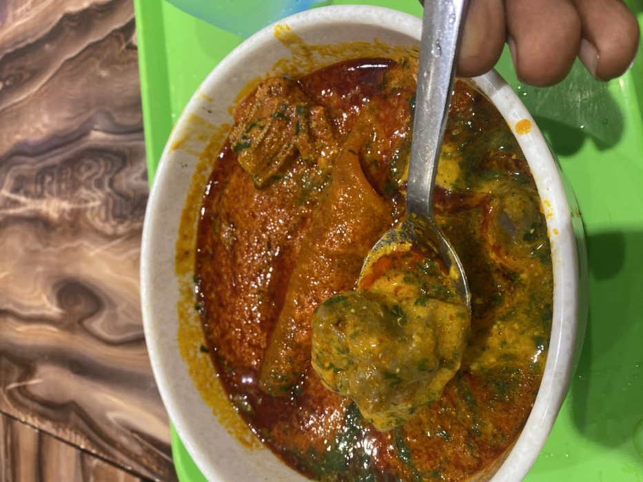 This image displays a close-up, eye-level view of a meal in Itirin, Nigeria