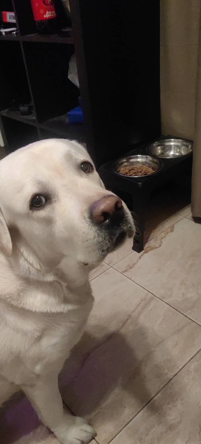 A white Labrador retriever stares upward with soulful eyes, a dark purple blotch on its nose. The dog stands to the left of a black stand holding two stainless steel bowls. One bowl is full of dry dog food, the other is empty. Behind the stand is a dark wooden shelf. The floor is tiled with large square tiles in a beige hue with darker swirls and lines. A beige curtain hangs partially visible to the right.