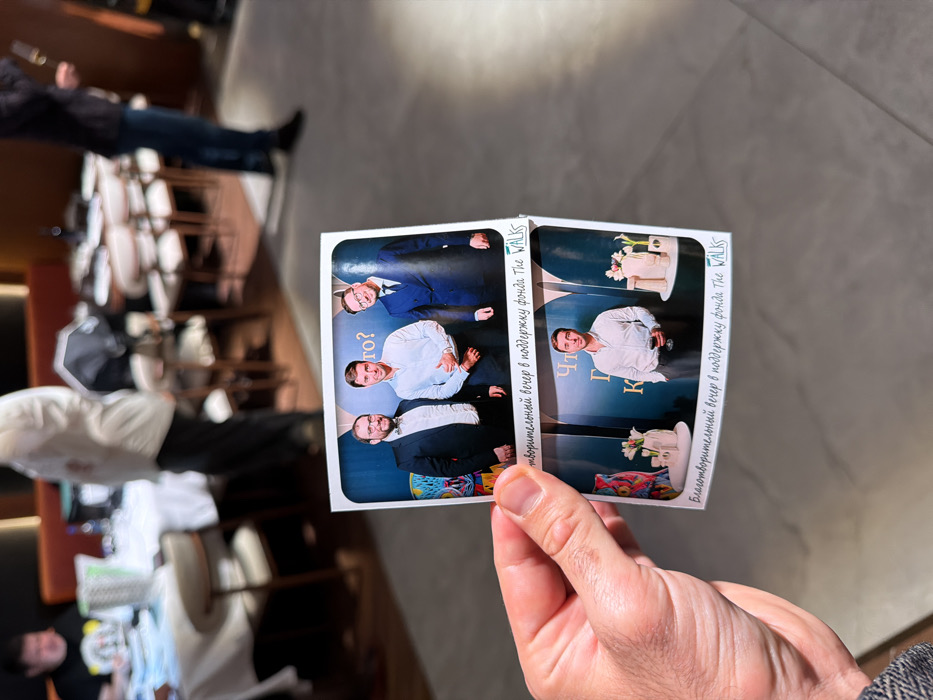 A hand holds a split photograph. The left side features three men in descending order: one in a suit and glasses, one in a light blue shirt, and one in a suit with a beard. Text above them reads "то?" in Cyrillic. The right side shows a man with a wine glass, next to a cake with lilies. Additional text is printed along the side: "Благотворительный вечер в поддержку фонда The WALKS" which translates to "Charitable evening in support of the WALKS Foundation" in Cyrillic. A blurry background shows an indoor event setting.