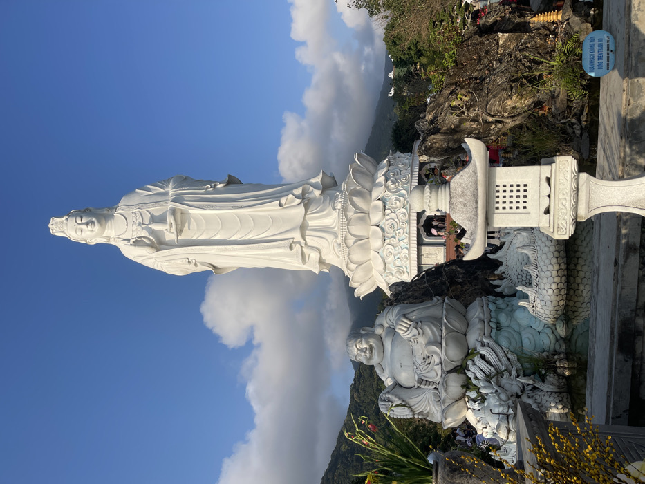 - "The image depicts an outdoor scene within a Buddhist temple complex in Sơn Trà Ward, Vietnam, under a blue sky dotted with scattered white cumulus clouds" by FM-qNkR42, licensed under CC BY 4.0