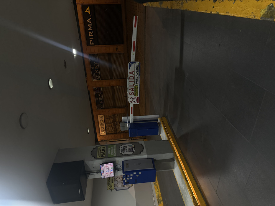A parking garage exit features a barrier gate with a "SALIDA" (Exit) sign in Spanish