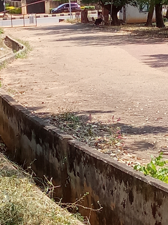 This image depicts an outdoor scene in the city of Bar Jirgi Summa, Nigeria, under clear daylight with strong shadows. The foreground features a concrete drainage ditch, partially filled with dry grass and green vegetation, extending diagonally from the bottom left towards the center. The ditch's inner wall displays dark stains and some sediment. Above the ditch and extending into the midground is a wide, unpaved or dirt path, scattered with dry leaves and sparse patches of green and reddish vegetation. Elongated shadows from off-frame objects are cast across this path. In the background, the dirt path appears to converge with a paved road. To the left, a dark-colored metal gate, resembling a security barrier, is partially visible, leading to the paved road which features a white curb. A dark purple or blue sedan is positioned on this paved road, facing right. Further behind the road, buildings with reddish roofs and green trees are discernible. To the right background, several trees with dark trunks stand, and beneath them, a small, light-colored building with a dark roof is visible, along with indistinct dark objects near its base. No identifiable individuals are present, and no overt human actions or interactions are depicted.