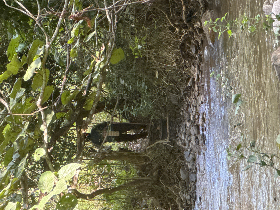 The image depicts a natural outdoor scene in the City of Pai, Thailand. In the foreground, a shallow river or stream with clear, flowing water and a rocky bed extends across the width of the frame. Small green plants grow on the near bank and along the waterline. The midground features the far bank, a rocky slope covered in exposed tree roots and dense undergrowth. A rudimentary path with visible steps, seemingly carved from earth and reinforced by roots, ascends this bank into a dense treeline. One individual is visible from the back, ascending this path, moving away from the viewer and into the dense vegetation. The person wears dark long-sleeved clothing and dark pants, with a lighter, possibly patterned, fabric hanging from their lower back. The background consists of a dense canopy of lush green foliage and tree branches, casting areas of shadow and dappled sunlight, creating a verdant, enclosed environment.