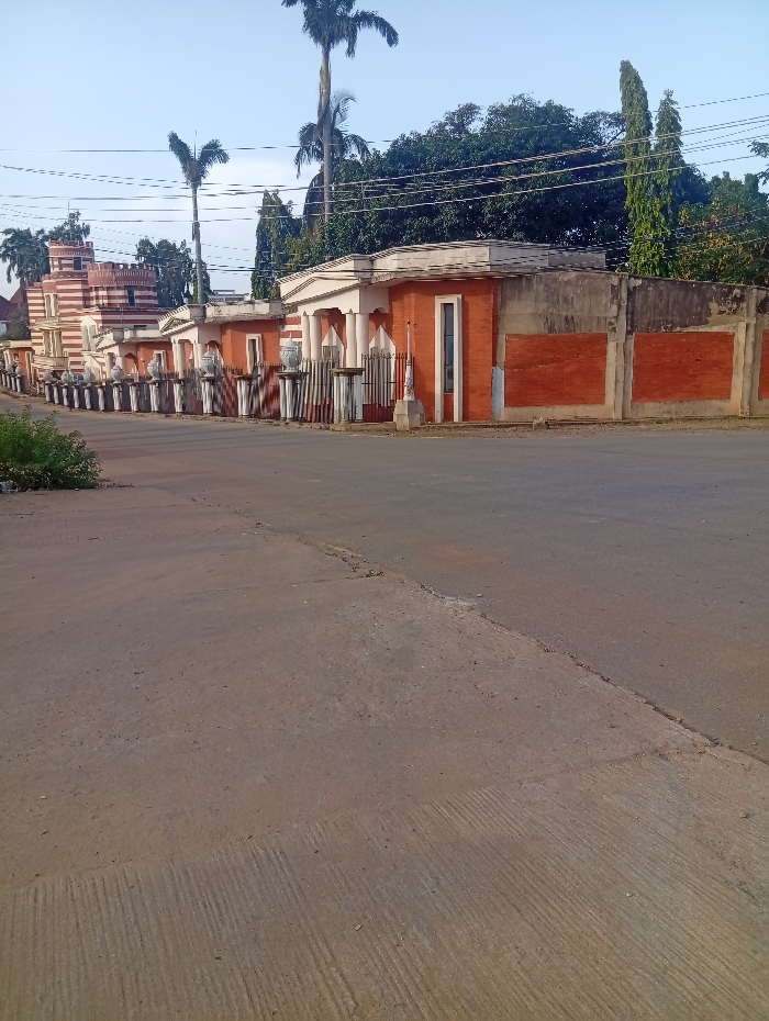 The image depicts a static, daylight scene from a paved road in Okengwe - Obehira, Nigeria, showing a complex of buildings and a perimeter fence