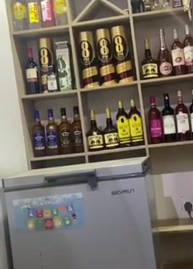 bar area with a white Skyrun freezer in the foreground. Behind the freezer, there's a wooden shelving unit holding an assortment of alcohol bottles, including brands like "8 PM," "Pop Cream," and "Best." The top shelves contain various spirits, wines, and smaller bottles. There is an electrical outlet and a power cord visible on the lower right, near the base of the shelf. Music is playing in the background.