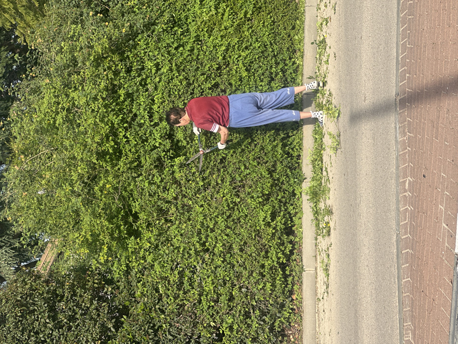 - "An outdoor scene in Beit Yitshak Sha'ar Hefer, Israel, depicts an individual actively trimming a large green hedge" by FM-RIphO2, licensed under CC BY 4.0