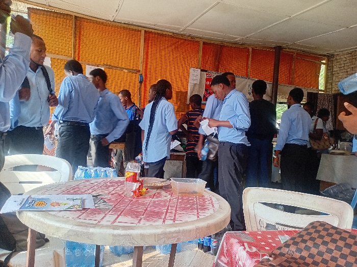 A group of people, predominantly young adults, are gathered indoors. Many are wearing blue shirts and dark pants or skirts, suggesting a uniform. They seem to be in a casual or semi-formal setting, possibly a gathering after a school event. A round table with a red and white checkered pattern is visible, cluttered with snacks and water bottles. The background has an orange woven wall covering. The space appears somewhat crowded and possibly temporary or makeshift.
