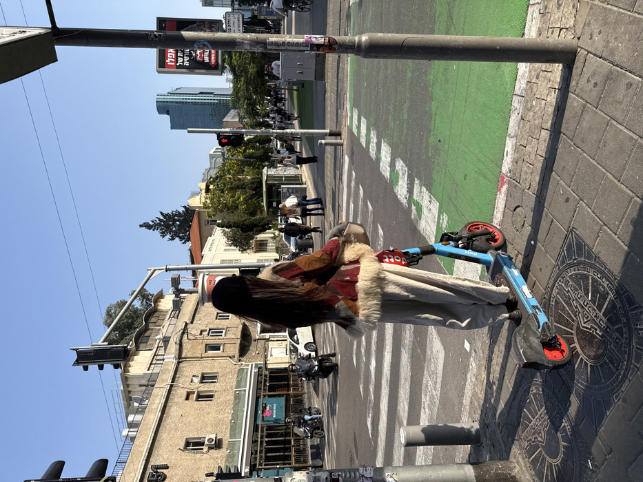 The image depicts an outdoor urban street scene at an intersection on Rothschild Boulevard in Tel-Aviv, Israel, under a clear blue sky. In the immediate foreground, a person stands facing away from the camera, positioned on a light blue Dott electric scooter. The person has long, dark hair and is wearing a multi-patterned jacket with patches of red, orange, brown, and grey, accented by light-colored fluffy trim around the collar and cuffs. They wear loose-fitting, light-colored pants. The scooter features red wheel hubs and the "dott" logo visible on its stem. The person is situated on a grey paver sidewalk, casting a discernible shadow. Beneath the scooter, a circular manhole cover with an intricate design and Hebrew script is partially visible. A grey cylindrical bollard is positioned near the curb to the left of the scooter. Directly in front of the main subject is a white-striped pedestrian crosswalk spanning a dark asphalt road. To the right of the crosswalk, a segment of the road is painted bright green, indicating a dedicated bicycle lane, also marked with white dashed lines. A tall, dark utility pole with various stickers is visible on the far right. Traffic lights are mounted overhead; one on the left shows a dark signal, while another further down the road displays red, indicating stopped traffic. Several vehicles, including white cars and two motorcycles, are visible stopped at the intersection on the asphalt road beyond the crosswalk. On the left side of the frame, an older, multi-story building with a light brown facade and visible "1951" numbering on its upper floor stands. It features multiple windows, air conditioning units, and a dark storefront at ground level. A large metal pole supporting traffic lights extends from the left. Trees and foliage are visible behind this building. On the right side of the intersection, a paved pedestrian area features numerous people walking. A green-roofed structure, possibly a bus shelter, is present. Further in the background, a distinct modern glass-clad skyscraper with a curved facade is visible. Two billboards are affixed to a pole on the right, one clearly displaying "BUFFALO" in English and Hebrew text above it. A cyclist is visible in the far distance on the right. Long shadows are cast across the sidewalk and road, indicating direct sunlight from the side.