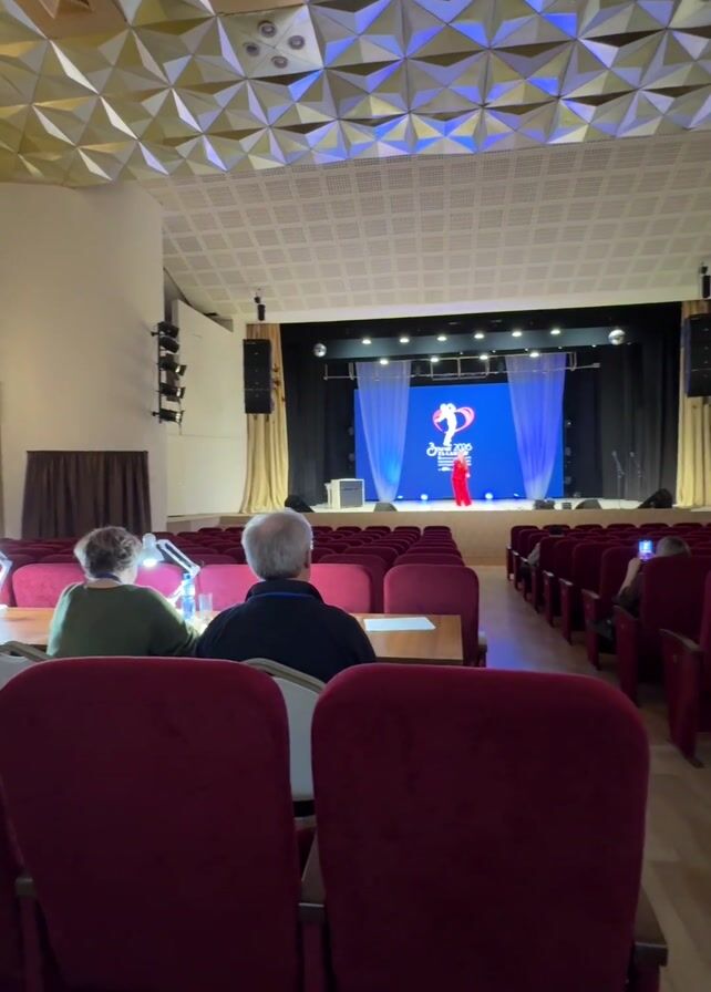 n auditorium with rows of red velvet seats facing a stage. On the stage is a large screen displaying a blue logo with a figure in a red dress. A person in a red dress is standing on the stage, seemingly singing. The stage is flanked by curtains and speakers. The auditorium appears mostly empty, with only a few people seated in the audience. The ceiling of the auditorium has a geometric, faceted design with lighting that changes color. There are tables in front of some of the seats, suggesting a conference or performance setting.