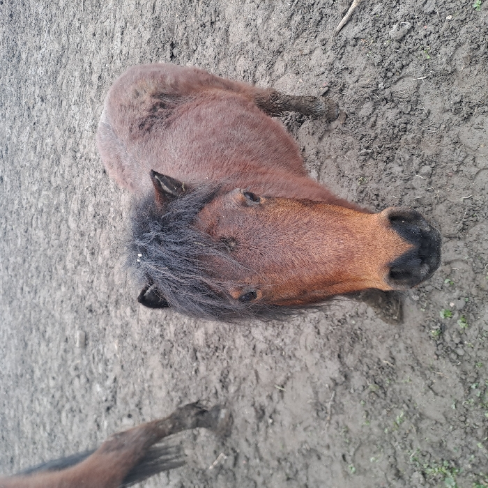 The scene is located in the city of Lambres-lez-Douai, France. The primary subject is a medium-sized reddish-brown pony, positioned centrally and facing the viewer. The pony has a thick, dark brown to black mane and forelock, with small white specks visible on its forelock. Its lower legs are encrusted with dark mud. In the upper left background, the lower portion of another animal's dark brown leg, also covered in mud, is partially visible. The ground throughout the visible area consists of uneven, light brown to grey-brown mud, marked with hoof prints and sparse patches of green vegetation. The overall environment is an unpaved outdoor enclosure characterized by wet, muddy conditions.