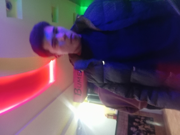 An indoor scene in Takhtakuprik, Uzbekistan, features a young man centered in the foreground, facing the camera. He has dark hair and wears a dark puffer jacket over a dark shirt. Blue light illuminates the right side of his face and parts of his jacket. Behind him, to the left, another individual is partially visible from the back, wearing a reddish-brown garment. The environment is characterized by artificial colored lighting, with a prominent red curved light fixture on the ceiling and a green light source on the right side of the frame. A sign partially displaying the letters "BUME" in red is visible in the mid-ground. To the left, a light-colored wall features a dark mantelpiece or counter structure, above which a red cylindrical object, possibly a fire extinguisher, is mounted. Below the mantelpiece, a framed image depicting a group of people is visible. The floor appears light-colored and uniform. No direct interaction between the individuals is evident.