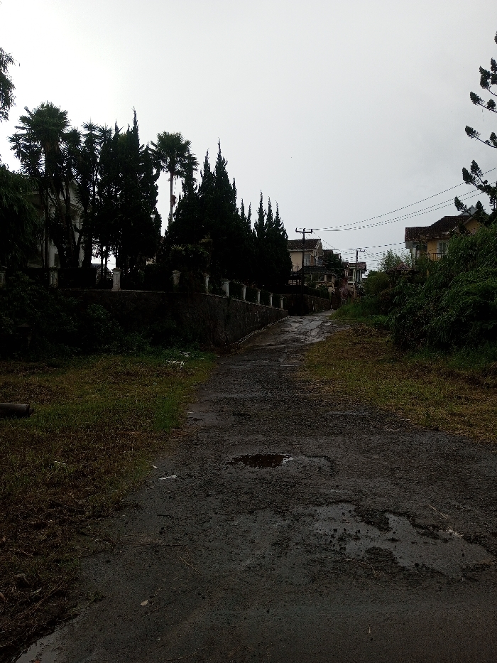 A narrow, dark paved path winds uphill, lined by greenery and trees. Buildings are visible in the distance, partially obscured by the vegetation. The sky is overcast, contributing to the somber mood. The path surface is weathered with puddles, suggesting recent rain. A low stone wall borders the path on the left, adding depth to the perspective. The overall scene evokes a sense of quiet isolation.