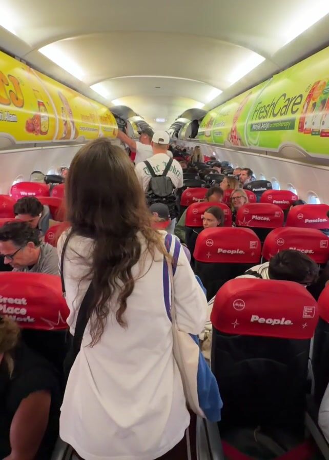 The interior of a passenger airplane is shown from the back. The plane appears full, as the red seats are occupied by people in various states of readiness for flight. Overhead advertisements are displayed in yellow and green. A young woman with long brown hair walks forward down the aisle. She is wearing a white jacket, black shorts and carrying a shoulder bag.