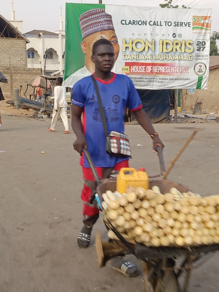 In an outdoor scene, a man pulls a wheelbarrow filled with what appear to be peeled sugar canes. He wears a blue T-shirt, red shorts, and sandals. A banner in the background advertises support for Hon. Idris Danlami Muhammad for House of Representatives, referencing the Social Democratic Party (SDP) and representing Akwanga, Wamba, and Nassarawa in a federal constituency. A mosque is also visible in the background.