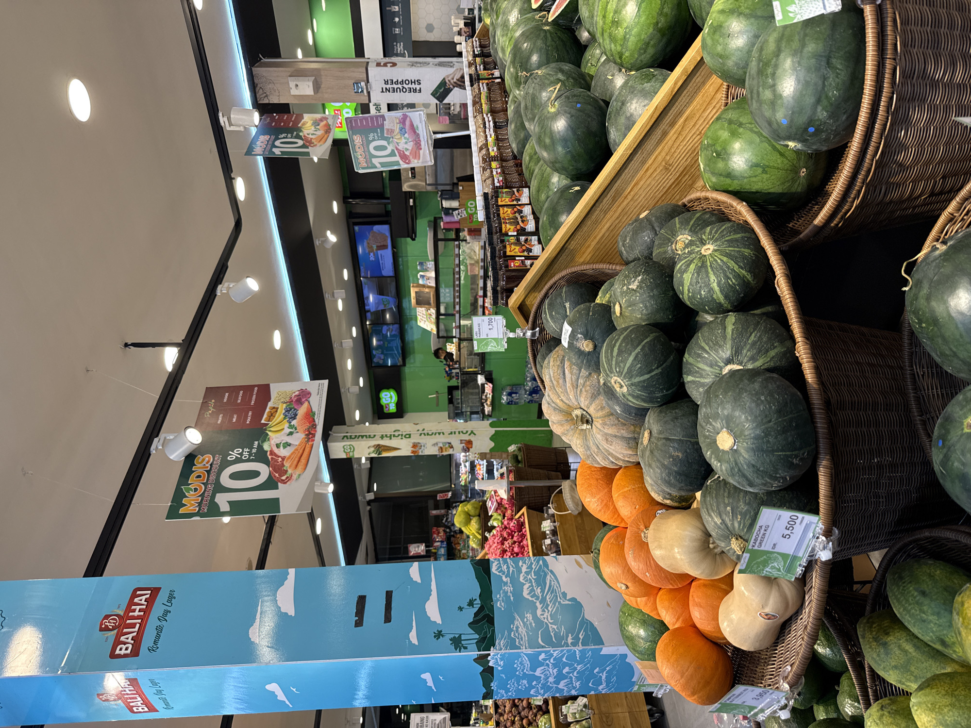 Here is a description of the image: The image captures a display of produce at a grocery store in Kutuh, Indonesia. Various squashes and pumpkins are arranged in woven baskets. There are dark green squash, striped squash, orange pumpkins, and tan pumpkins. Some of the squash have price tags indicating they are "Kabocha Green KG" and priced at 5,500 IDR. In the background, there are advertisements, including one for "Bali Hai Romantic Day Lager" and a "MODIS Morning Discount" sign. There are also grocery store shelves, more produce, and an individual near a checkout counter. The store is illuminated with fluorescent lights.