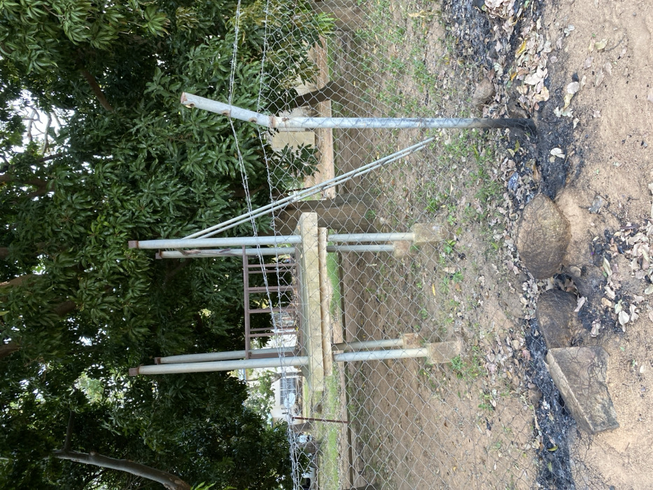 The scene is an outdoor area in the city of Gwong, Nigeria. A raised concrete platform, approximately 1.5 meters high, is centrally positioned, supported by four galvanized steel posts anchored in concrete bases. A short metal railing is present on the platform's surface. Directly in front of the platform, a galvanized chain-link fence topped with barbed wire runs horizontally across the frame. A single metal fence post on the right side leans inward significantly. Two parallel galvanized metal bars lean against the platform's underside, extending from the ground. The foreground ground surface consists of packed dirt with sparse green grass and scattered dry leaves. A distinct patch of black ash and charred material is visible in the lower right foreground, indicating a localized burn. Within this burnt area are a rectangular concrete block and two irregular, dark, rounded objects. The background is dominated by the dense green foliage of large trees, with faint outlines of light-colored distant structures discernible through the vegetation. No human or animal subjects are present.