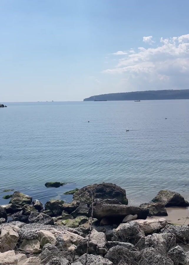 rocky shoreline meeting a calm, blue ocean under a partly cloudy sky. The foreground features large, lichen-covered rocks leading to a small sandy beach area. In the distance, a headland is visible, and several birds or ducks are floating in the water. Two ships are also faintly visible on the horizon. The water is clear, and the overall scene is peaceful and serene.