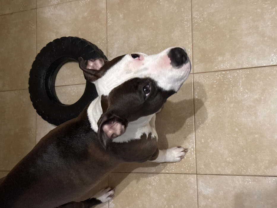 - "The image displays a dark brown and white dog, consistent with a Pit Bull type breed, positioned on a light tan tiled floor" by FM-hkxCe2, licensed under CC BY 4.0