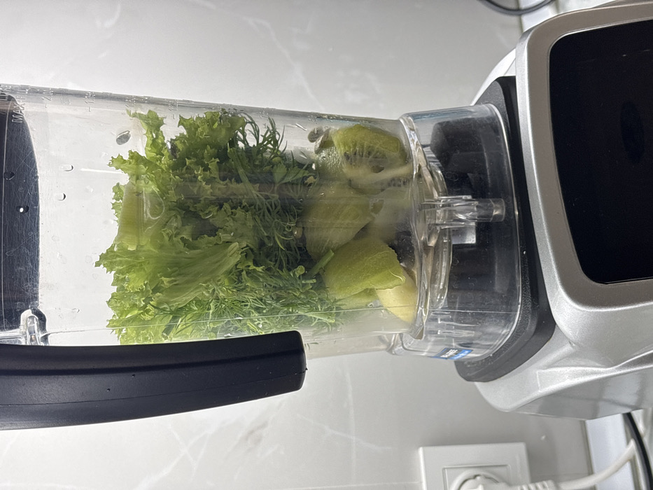 A clear plastic blender pitcher, featuring a black handle, is positioned on a silver and black motorized base. The pitcher contains various ingredients, including loose green leafy lettuce and dill sprigs occupying the upper volume. Below these, multiple light-green peeled kiwi slices with visible black seeds are present, mixed with other irregular light-green fruit or vegetable chunks at the bottom. Water droplets adhere to the interior walls of the pitcher. The blender is situated on a light-colored countertop. In the background, a light grey or white wall is visible, with a white electrical outlet and a white cord plugged into it on the left side of the frame. No identifiable features within the image indicate a specific location in Tbilisi, Georgia.