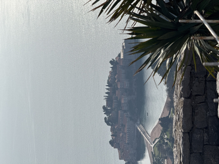 The image presents a high-angle, long-distance view of Sveti Stefan island and its surrounding seascape, observed from the vicinity of Čelobrdo, Montenegro. The upper two-thirds of the frame are dominated by a vast body of water, likely the Adriatic Sea, which exhibits shimmering sunlight reflections across its surface, giving it a hazy, light grey appearance. In the midground, Sveti Stefan island is visible, characterized by a dense cluster of multi-story buildings featuring light-colored stone facades and prominent reddish-orange terracotta tiled roofs. The island's topography is uneven, with several evergreen trees, some conical in shape, interspersed among the structures and along the perimeter. A narrow, elongated causeway extends from the island towards the mainland, connecting to a stretch of sandy beach. Multiple small, indistinct human figures are discernible walking along the causeway. A single small, dark-colored boat is positioned in the water adjacent to the causeway, closer to the island's left side. The immediate foreground on the lower left consists of a section of a stone wall constructed from irregularly shaped, dark grey blocks. On the lower right, the spiky, dark green leaves of a large plant, possibly a type of yucca or palm, are partially visible, obscuring part of the distant view. Below and to the left of the plant, thin, light-colored vertical bars, consistent with a railing, are present. The overall lighting suggests a bright, possibly hazy, daytime condition.