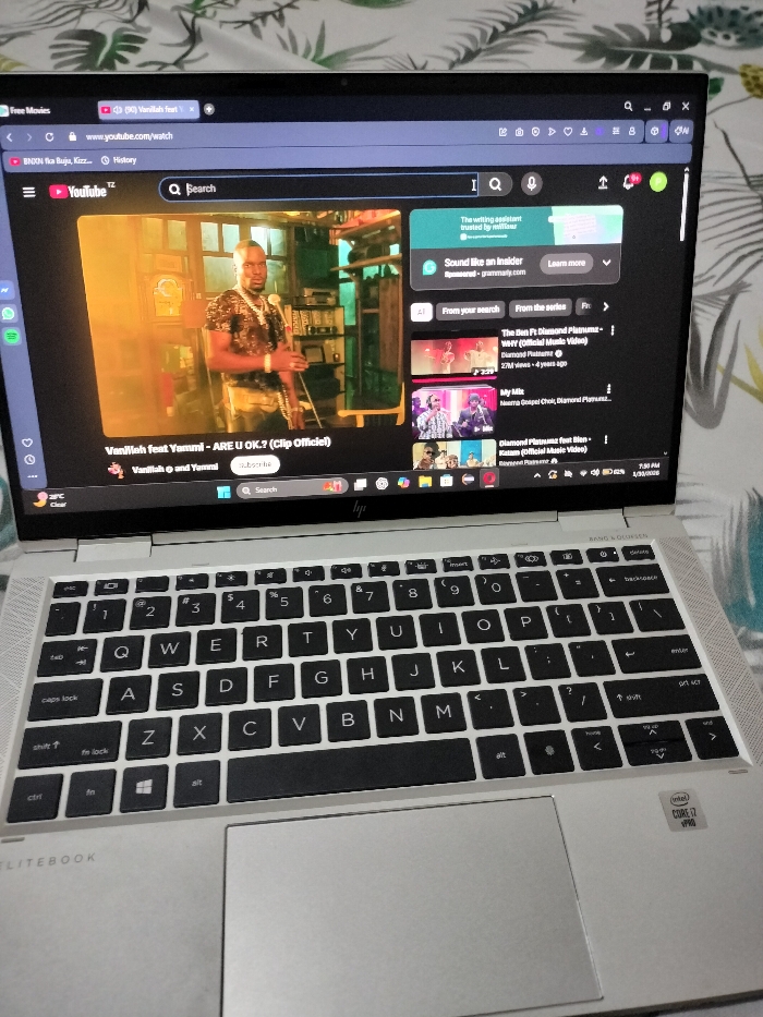 A laptop displays a YouTube video of Vanillah feat Yammi - ARE U OK.? (Clip Officiel). The YouTube interface shows a search bar, recommended videos including "The Ben Ft Diamond Platnumz- WHY" and "Diamond Platnumz feat Bien! - Katam", and a Grammarly ad. The laptop keyboard and trackpad are visible below the screen, revealing the HP EliteBook brand and an Intel Core i7 vPro sticker. The laptop rests on a bed with a patterned floral bedsheet.