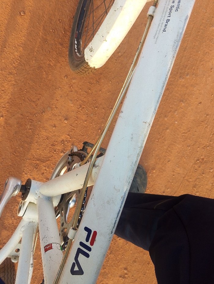 An angled close-up showcases a white bicycle with the "FILA" logo prominently displayed. The frame is slightly weathered, with the words "Authentic Sport Brand" visible. A section of the front wheel, complete with a white fender, is in view. Part of the bike's chain and pedal mechanism are also seen. The bike rests on a reddish-brown surface, possibly dirt or clay. A person's leg, clad in black pants, is positioned next to the bike frame.