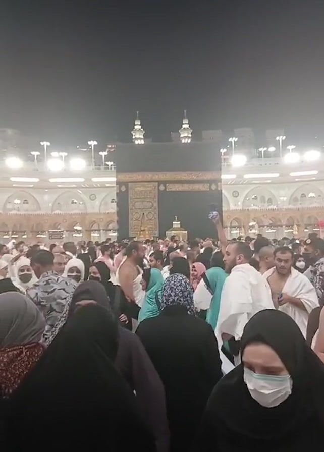crowd of people gathered in a large, open space with a significant, cube-shaped structure in the background. The structure appears to be the Kaaba in Mecca, Saudi Arabia, a sacred site for Muslims. The crowd is diverse in age and attire, with many individuals wearing traditional Islamic clothing. Some are also wearing face masks. People are standing, walking, and some are holding up their phones, possibly to take photos or videos of the Kaaba. The environment seems to be well-lit with overhead lights, suggesting it may be nighttime. The overall atmosphere appears to be one of reverence and devotion.