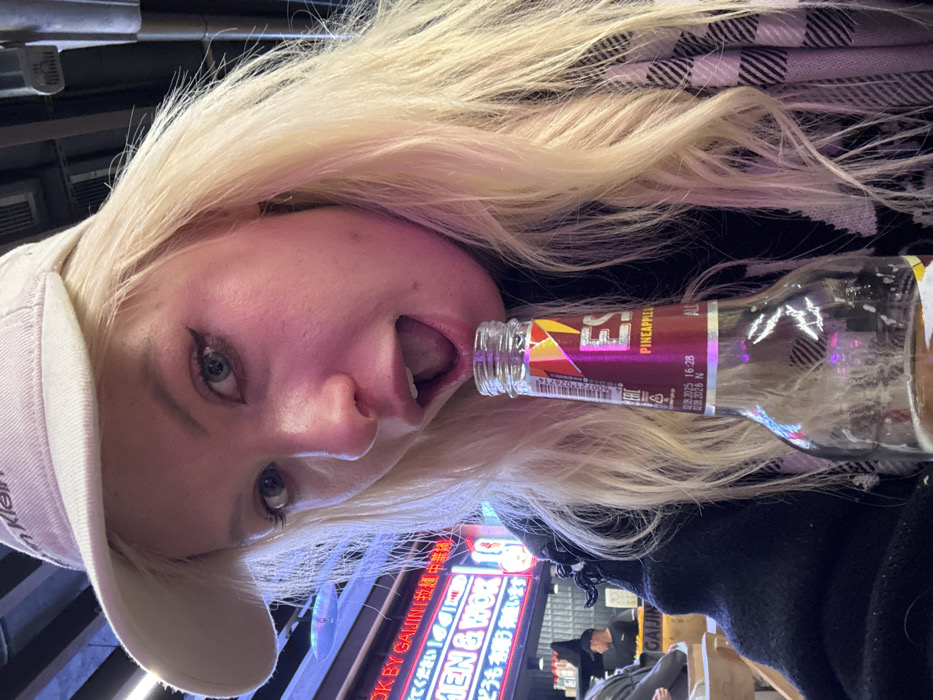 A blonde woman wearing a baseball cap is taking a selfie with a bottle of beer nearly touching her mouth. The woman is looking at the camera. The background shows a glimpse of a street, with the illuminated signage of a restaurant, "OK BY GAIJIN" in Japanese and English, which serves ramen and wok dishes. The text on the beer bottle includes "PINEAPPLEL" and expiration dates. There is also writing in Japanese on the bottle label and signage.