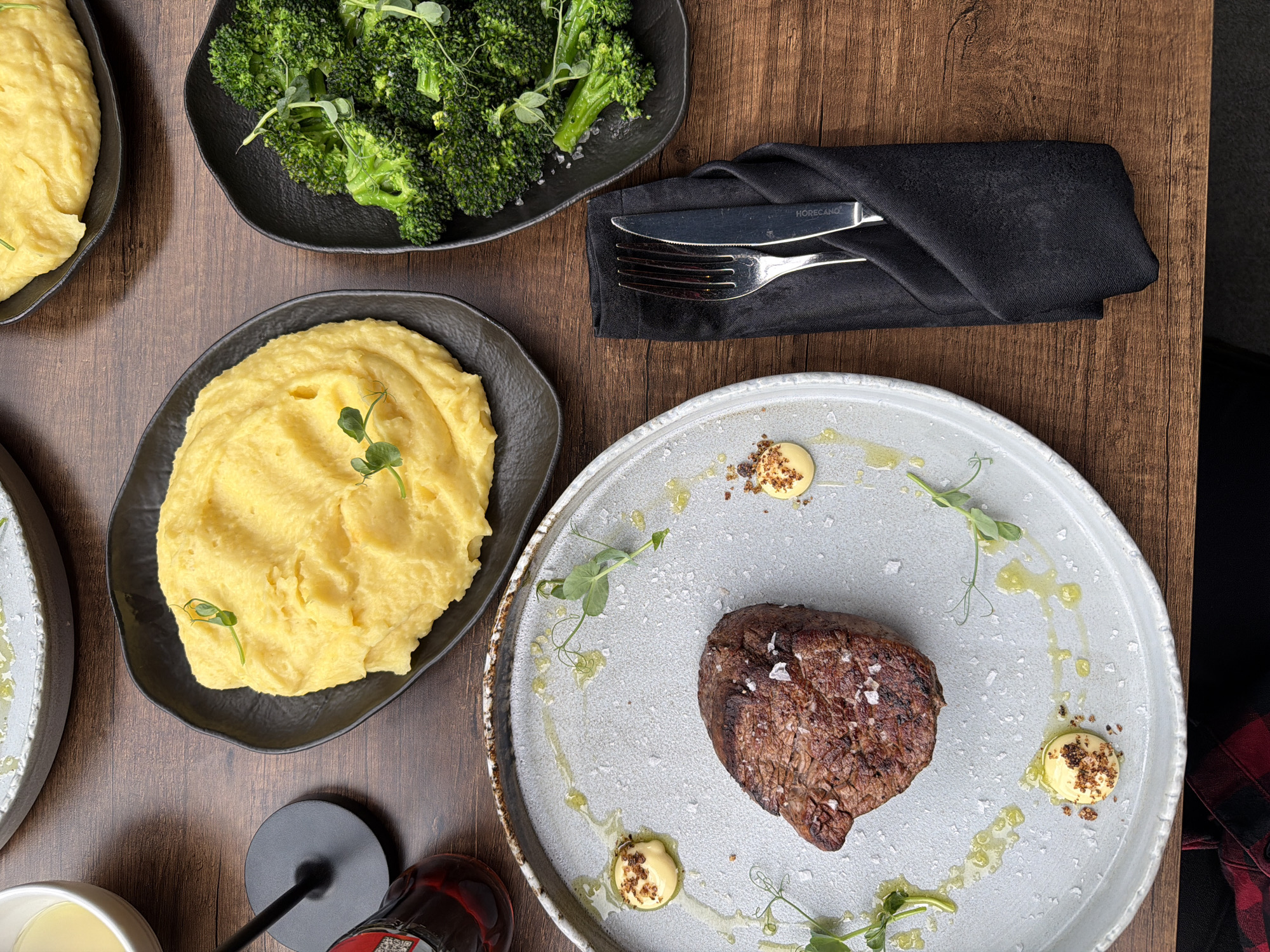 meal served on a wooden table. The meal includes a steak served on a grey plate with small dollops of butter and pea shoots, a side of mashed potatoes served in a black dish, and a side of broccoli served in a black dish. A fork and knife are wrapped in a black cloth napkin. The location is possibly a restaurant in Bansko, Bulgaria. A wine glass and bottle are partially visible in the lower portion of the frame. A small portion of someone's shirt is seen in the bottom right of the picture.