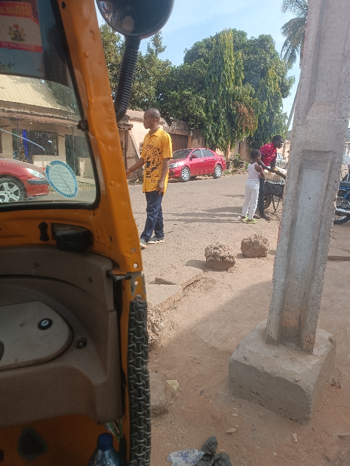 - "The image depicts a street scene in Ungwan Liman, Nigeria, viewed from the interior of an orange motorized trishaw, or keke napep, positioned on the left side of an unpaved road" by FM-yVZQx2, licensed under CC BY 4.0