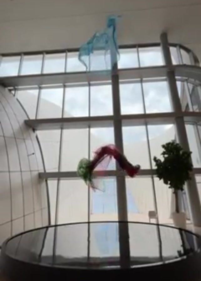 A low angle shot displays a modern interior space with a large window wall and a reflective round fountain. A kinetic sculpture hangs above the fountain, featuring fabric-like elements in blue, green, and red that move in the air currents. A potted tree sits near the edge of the frame, and the background visible through the window wall suggests an overcast day.