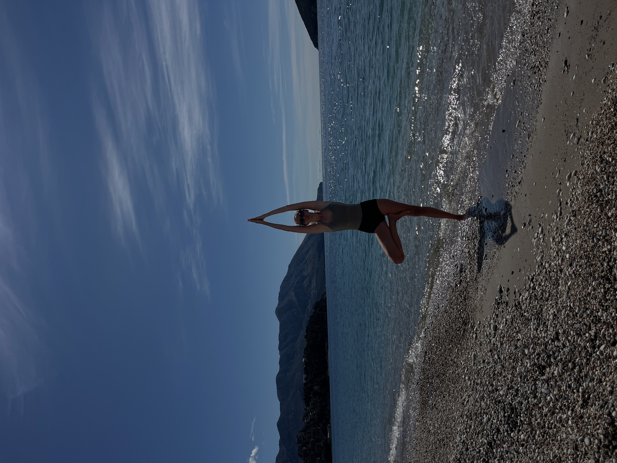 A woman is performing a yoga pose on a beach in Budva, Montenegro
