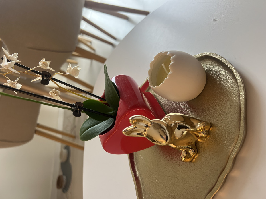 The image displays a still life arrangement located within an interior setting in Sofia, Bulgaria. A golden, textured, irregularly-shaped decorative tray rests on a white, smooth table surface. Positioned on the tray are three primary objects: a vibrant red, heart-shaped ceramic planter containing a small orchid plant with dark green leaves and two vertical stakes supporting stems with multiple small, white, seemingly dried or wilted flowers; a glossy golden ceramic figurine of a seated rabbit, facing slightly right; and a white, ceramic, egg-shell shaped candle holder containing an unlit yellow-colored candle. The candle holder features a jagged top edge resembling a cracked egg. The background is out of focus, revealing light-colored walls and the lower portions of several light-colored wooden chairs with slender legs. Further blurred elements on a lower surface or floor in the background appear to be two small, light-colored circular objects.