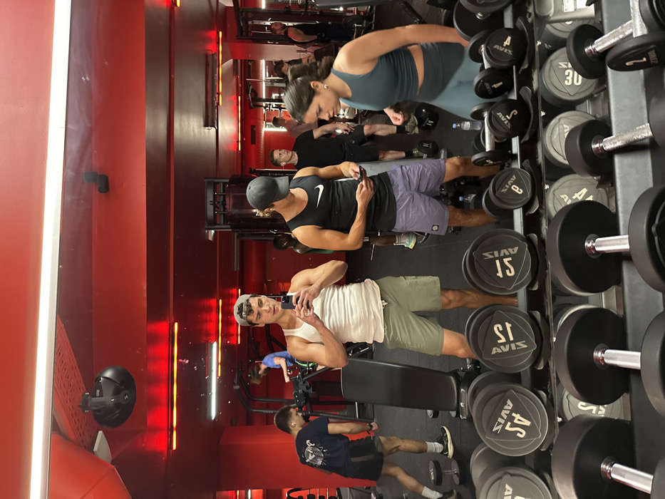 The image captures a gym scene with multiple individuals engaged in various activities. A man in a white tank top is taking a selfie near a weight rack. Another man in a black tank top is looking at his phone while standing nearby. A woman in athletic wear is seen in the background, possibly exercising. The gym is equipped with weight racks holding dumbbells labeled with various weights, including 8, 15, 30, and 45. The interior features a red color scheme.