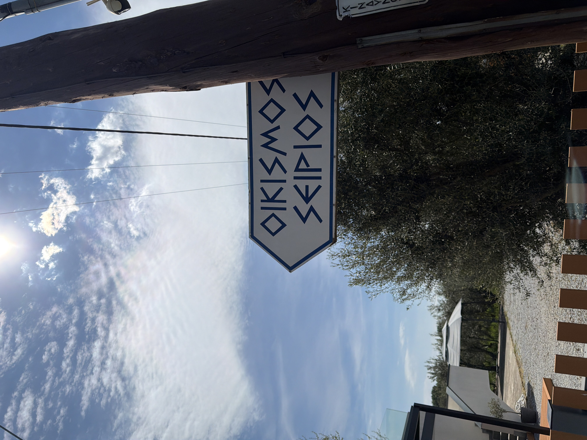 A low-angle, daylight shot shows a sign with the Greek words "OIKISMOS SEIKIOS" (Οικισμος Σεικιου) in dark blue lettering on a white background with a dark blue border, which is hanging from a weathered wooden beam