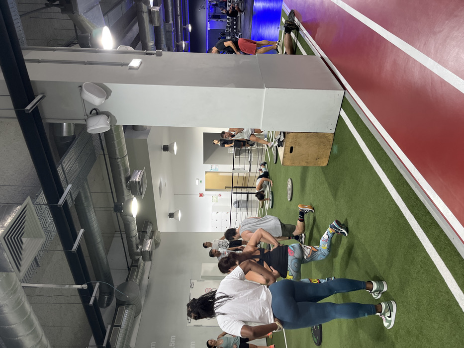This image depicts a functional training area within a fitness center located in Oeiras, Portugal. The scene features multiple individuals engaged in various exercises on a green artificial turf floor marked with white lines, adjacent to a red track area also with white lines. In the foreground, a woman with dark braided hair, wearing a white t-shirt, teal leggings, and light green and white athletic shoes, stands with her back to the camera, hands on her hips, observing the activity. To her right, another woman in a black tank top and brightly patterned leggings is performing a forward lunge. Next to her, a man in a light grey t-shirt and dark shorts is also executing a lunge. On the green turf, black circular weight plates are scattered, and a wooden plyometric box is visible to the right of the lunge exercisers. Further into the mid-ground, a woman in a white top and dark bottoms is performing a push-up on the green turf. Several other individuals are standing or moving in the background, including a group near white locker units and a light-colored wooden door. An individual in a dark shirt and red shorts is visible standing on the red track to the right, behind a large white structural pillar from which white speakers are mounted. Beyond this pillar and further into the background, an area with blue ambient lighting showcases more gym equipment and additional exercisers. The ceiling features exposed industrial-style ventilation ducts, electrical conduits, and various suspended and recessed lighting fixtures, along with ceiling vents. White walls with minimal signage, including what appears to be an exit sign, frame the background. The overall environment is brightly lit and active, indicating a dedicated workout space.