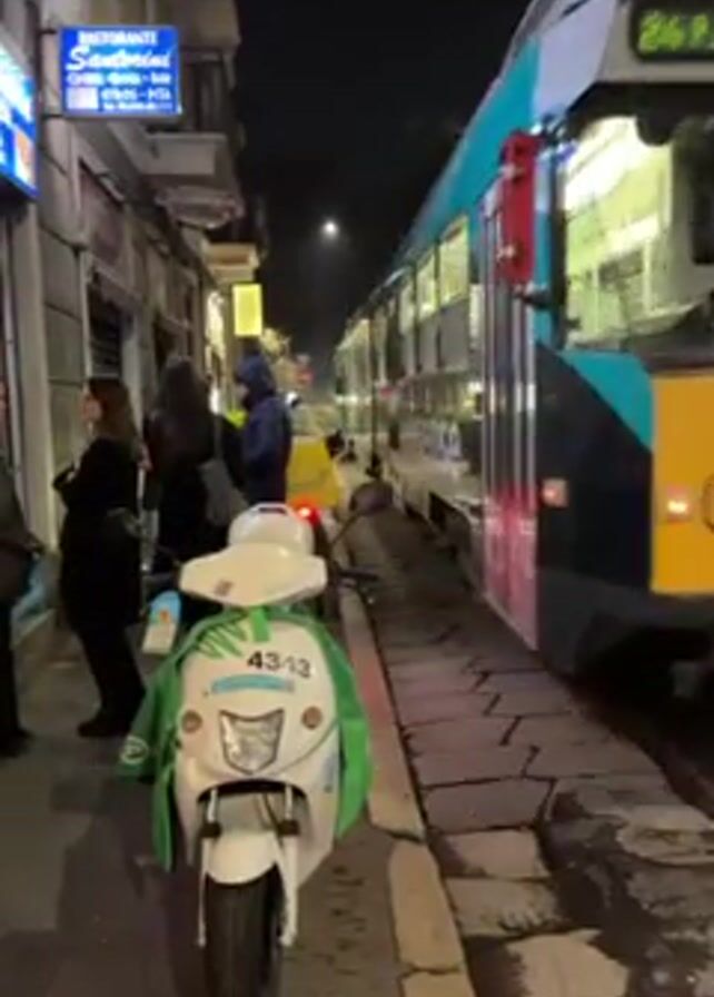 At night, a tram passes close to a sidewalk on a European city street. A white scooter with green delivery bags attached is parked on the sidewalk. Several people wait on the sidewalk, next to a building with an Italian restaurant. The tram is predominantly yellow and blue. The scooter has the number 4343 on its front. The tram bears the name "Hisense" on its side. The street is illuminated by street lights and lights from the building. The moon is visible in the sky.