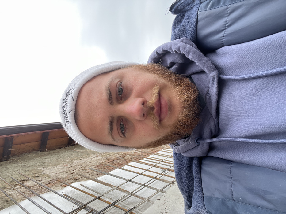 A male individual is depicted in a close-up, low-angle portrait, positioned outdoors in the city of Dupnitsa, Bulgaria. The subject, an adult male, has a reddish-brown full beard and mustache, and light-colored eyes. He wears a white knitted beanie with a dark embroidered pattern, a light periwinkle-colored hooded sweatshirt, and a navy blue sleeveless fleece vest over the sweatshirt. His gaze is directed forward, meeting the camera. The background to the left of the subject features a building facade constructed of old brickwork and partially covered with a lighter, textured material, possibly stucco. A section of the wall reveals exposed steel reinforcing bars (rebar) arranged in a grid pattern. Above this, a dark brown wooden beam or eave and a dark gutter are visible, indicating a roofline. The upper right portion of the background consists of an overcast sky, uniform in light gray tone. No specific actions or interactions beyond posing for the photograph are evident.