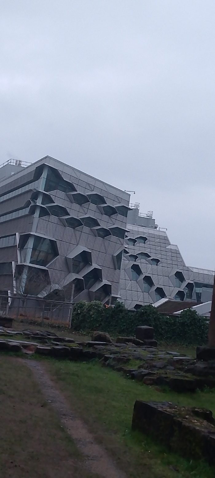 The image depicts a modern architectural structure, identified as the Manufacturing Technology Centre (MTC) Advanced Manufacturing Training Centre (AMTC) near Ansty Park, Coventry, United Kingdom, under an overcast sky. The multi-story building features a complex grey facade composed of interlocking hexagonal and trapezoidal elements, some of which are recessed glass windows and others are opaque panels, creating a textured, crystalline appearance. Visible roof structures and utility equipment are present on the building's upper levels. In the midground, a dark metal fence separates the building's grounds from the foreground. Immediately in front of the fence, a line of dense, green foliage is visible. The foreground contains an unpaved, light-colored dirt path running diagonally from the lower left towards the center. Surrounding this path are patches of green grass interspersed with numerous dark, irregularly shaped stone blocks and remnants, consistent with archaeological ruins or an undeveloped, rocky terrain. No individuals or active subjects are present in the scene. The overall lighting is flat and diffused, indicative of a heavily clouded day.