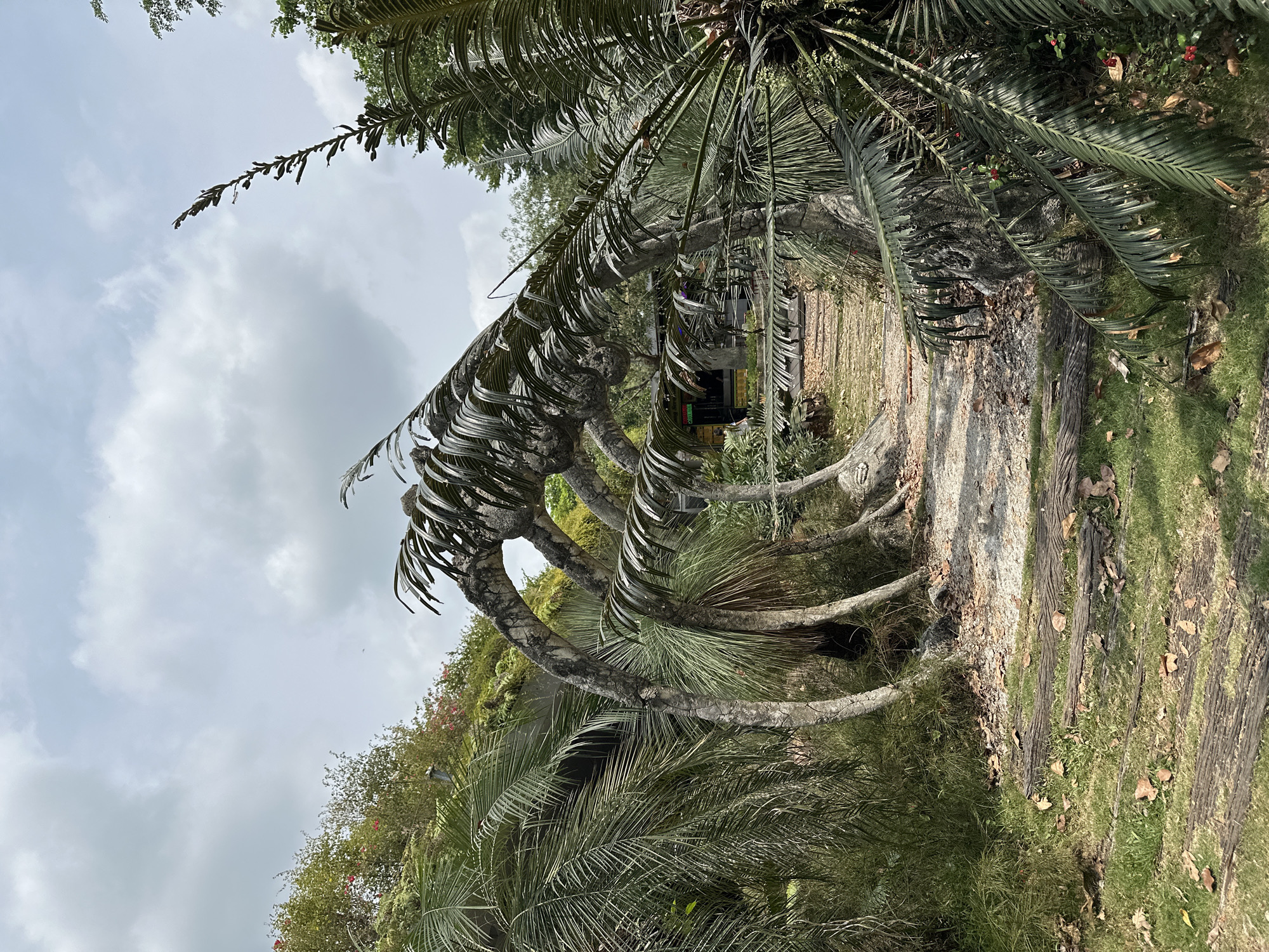 This image captures a section of an outdoor pathway within Haw Par Villa, Singapore. The primary visual element is a series of large, grey, textured structures resembling a dinosaur's rib cage, forming an archway over a pedestrian path. The path itself is composed of light-colored gravel interspersed with dark wooden planks laid horizontally, bordered by green grass and scattered dry brown leaves. Lush tropical foliage, including various palm-like plants, flanks both sides of the archway and path, with dense green and red-flowered vegetation covering a hillside to the left. Through the archway, a building with a yellow facade and a dark roof is visible in the mid-distance, displaying a partially visible green sign that reads "CAFE B..." above its entrance. One individual, wearing a light-colored top, is walking on the path towards this building, further into the scene. The sky is partly cloudy with significant white and grey formations.