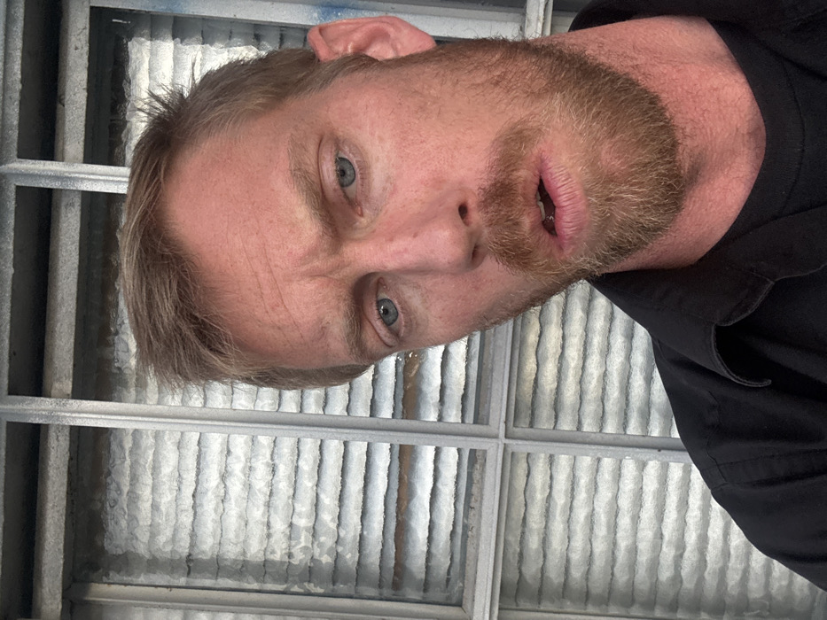 The scene depicts an adult male photographed in a close-up against a textured glass window, presumably within a building in the city of Los Angeles, United States of America. The subject has fair skin, reddish-blonde hair styled with some volume, and a reddish-blonde beard. His eyes are blue, and his mouth is slightly ajar. He wears a dark, collared button-up shirt over a dark t-shirt. The background consists of a window divided into multiple rectangular panes by a light-colored, possibly painted, grid frame. The glass within these panes is reeded or frosted, creating horizontal wavy patterns that obscure the view beyond. The lighting is diffuse and even, suggesting an indoor or shaded outdoor setting.