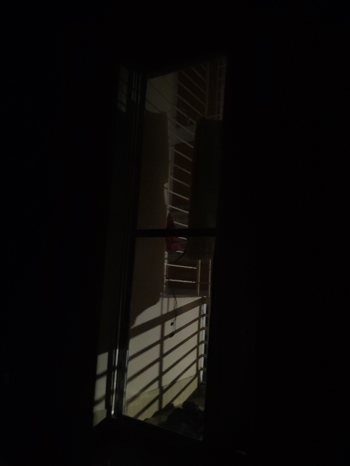 A darkened room is lit by a distant glow streaming in through a narrow window. Light from outside paints the adjacent building's balcony bars as shadows on the interior wall, mimicking a barred cell. A blurry figure hangs on a clothesline, and dark shapes rest on the balcony floor. The image is shrouded in darkness, with only the window's scene revealing any detail.