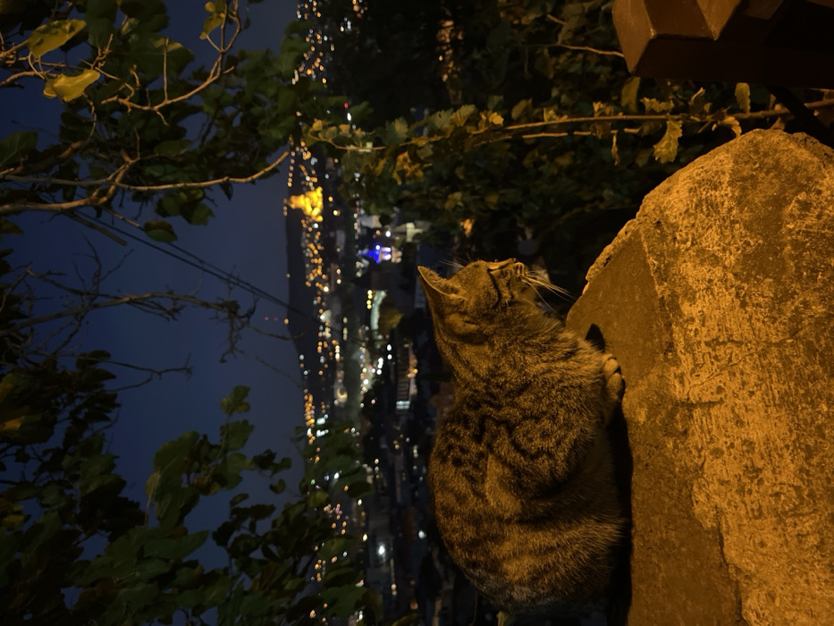 - "A tabby cat, exhibiting brown and grey striped fur, is seated in profile on a rough, yellow-orange illuminated stone ledge at night" by FM-jiFXL2, licensed under CC BY 4.0