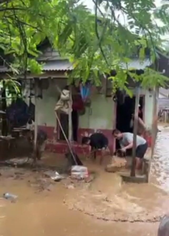 street in a village flooded with muddy water. Three men are working together, scooping water out of the entrance of a small, run-down building with a corrugated metal roof. The building is painted in faded colors. The water is flowing rapidly, and the men are working hard to clear the area. A person in a red shirt is walking through the floodwater in the background. Trees and other vegetation are visible around the buildings. The scene suggests a recent heavy rain or flood event in a low-lying area.