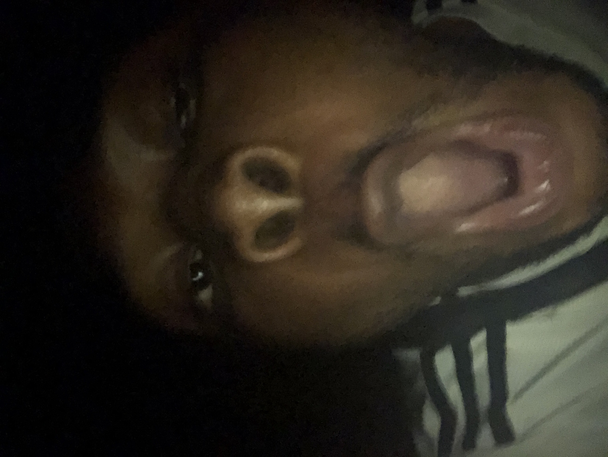 A close-up, tilted, low-light photograph shows a person with dark skin and facial features including eyes, nose, and an open mouth with visible tongue. They are wearing a garment with dark stripes on a lighter background. The location is Unknown, Unknown.