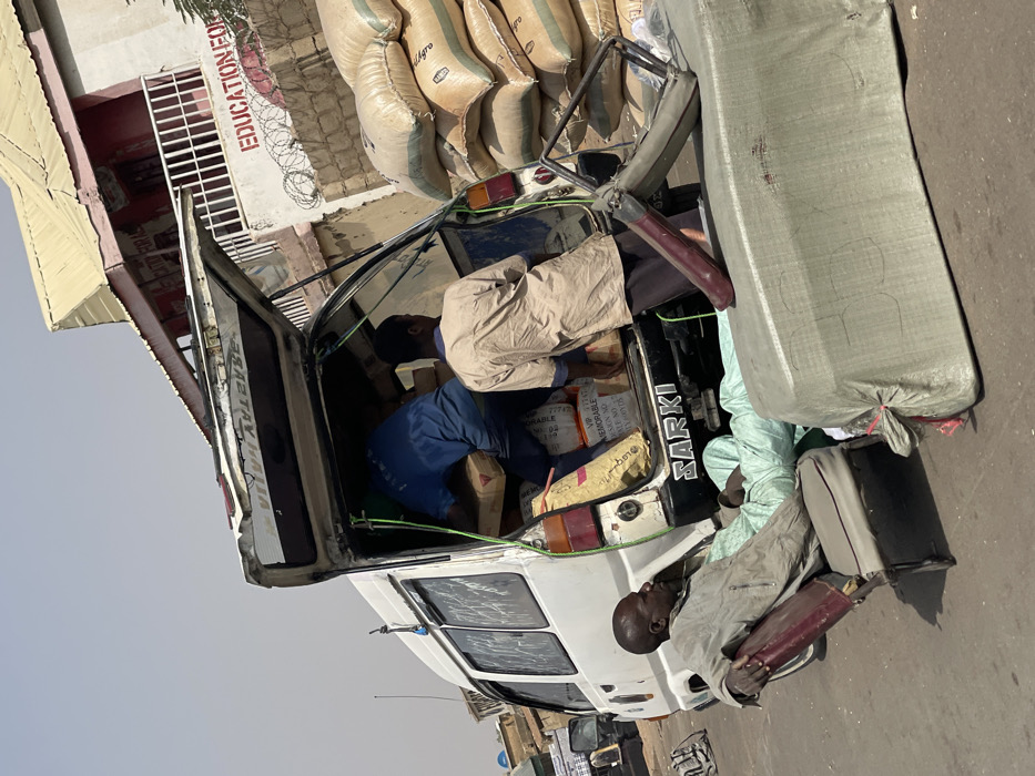 The scene is set outdoors in Hanwa, Nigeria, under bright daylight. A white minivan, possibly a Toyota Liteace model, is positioned with its rear hatch open, revealing a cargo compartment filled with various packages, including light-colored sacks and boxes. A male individual in a blue shirt is inside the van, engaged in loading or arranging items. Another male individual, wearing a light brown shirt over dark trousers, stands at the rear of the van, facing the interior. To the left of the van, a third male individual, dressed in a light grey jacket over a light green traditional garment, is reclined on a detached maroon and grey car seat placed on the asphalt ground. His legs extend towards a large, rectangular object wrapped in a grey tarp, which also rests on the ground. A detached car seat frame is positioned on top of this tarp-wrapped package. The van's rear bumper displays the word "SARKI". To the right of the van, a stack of large, light-colored sacks, some bearing the visible text "ARAGRO," is piled on the ground. In the background, a multi-story building with light-colored walls, pink accents, and a yellow corrugated metal roof is visible. Red text, including "EDUCATION FOR" and possibly "EDUCATION FOR ALL," is painted on the building's facade. Barbed wire is affixed to a low wall in front of the building. The ground surface is asphalt.