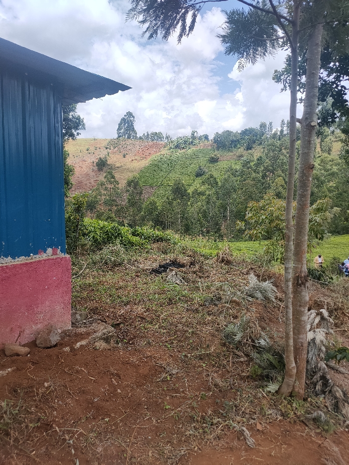 A building with blue siding and a red foundation stands on a reddish-brown, grassy hill. Debris from recent clearing litters the area. Beyond the building, a lush, green hillside climbs towards a cloudy sky. A mix of trees and cultivated fields dot the landscape. Two tree trunks stand prominently in the right foreground, partly obscuring two people in the distance.